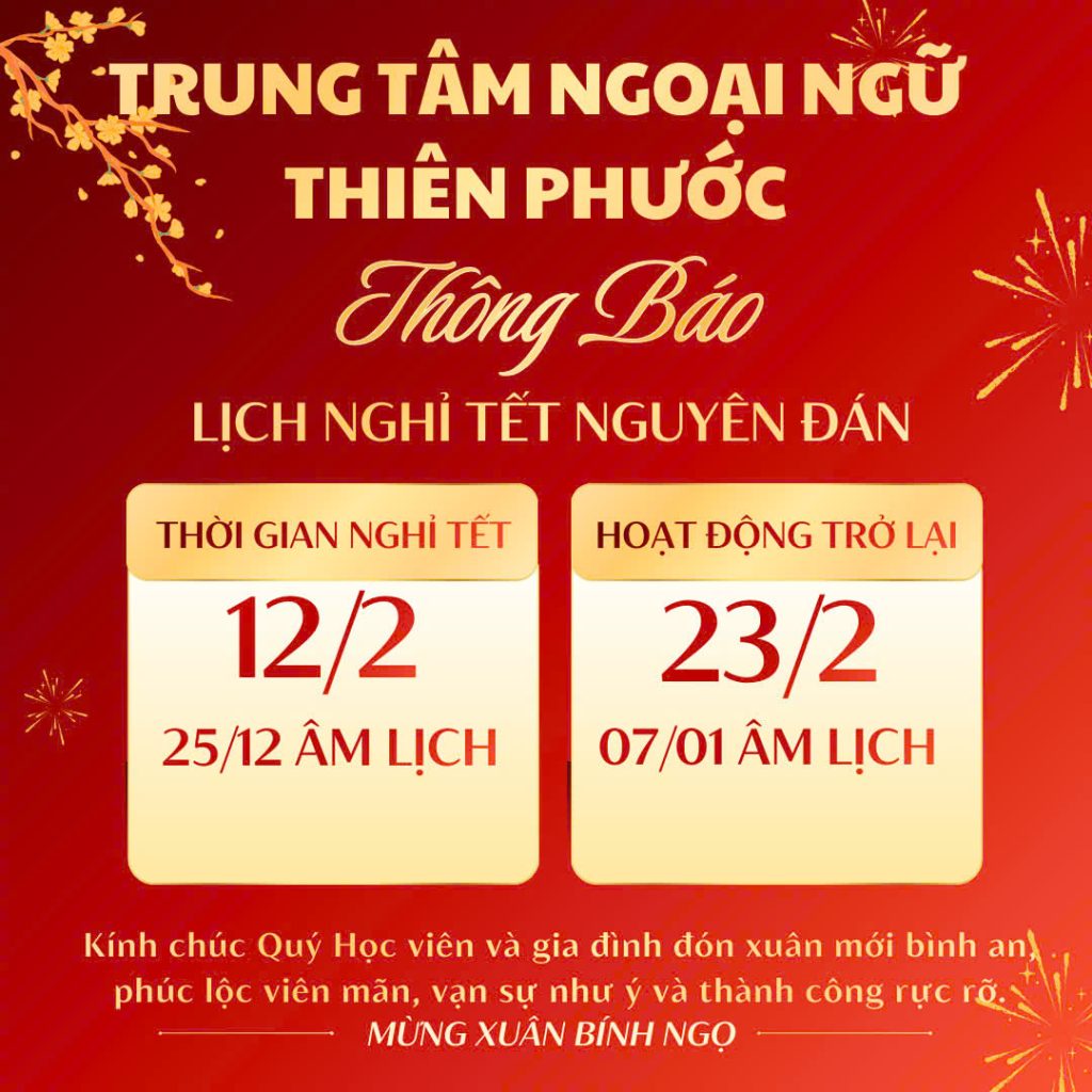 Trong không khí rộn ràng đón Tết Bính Ngọ, Trung tâm Ngoại ngữ Thiên Phước xin gửi lời chúc mừng năm mới đến toàn thể Quý học viên và gia đình: Bình an – Phúc lộc viên mãn – Vạn sự như ý – Thành công rực rỡ